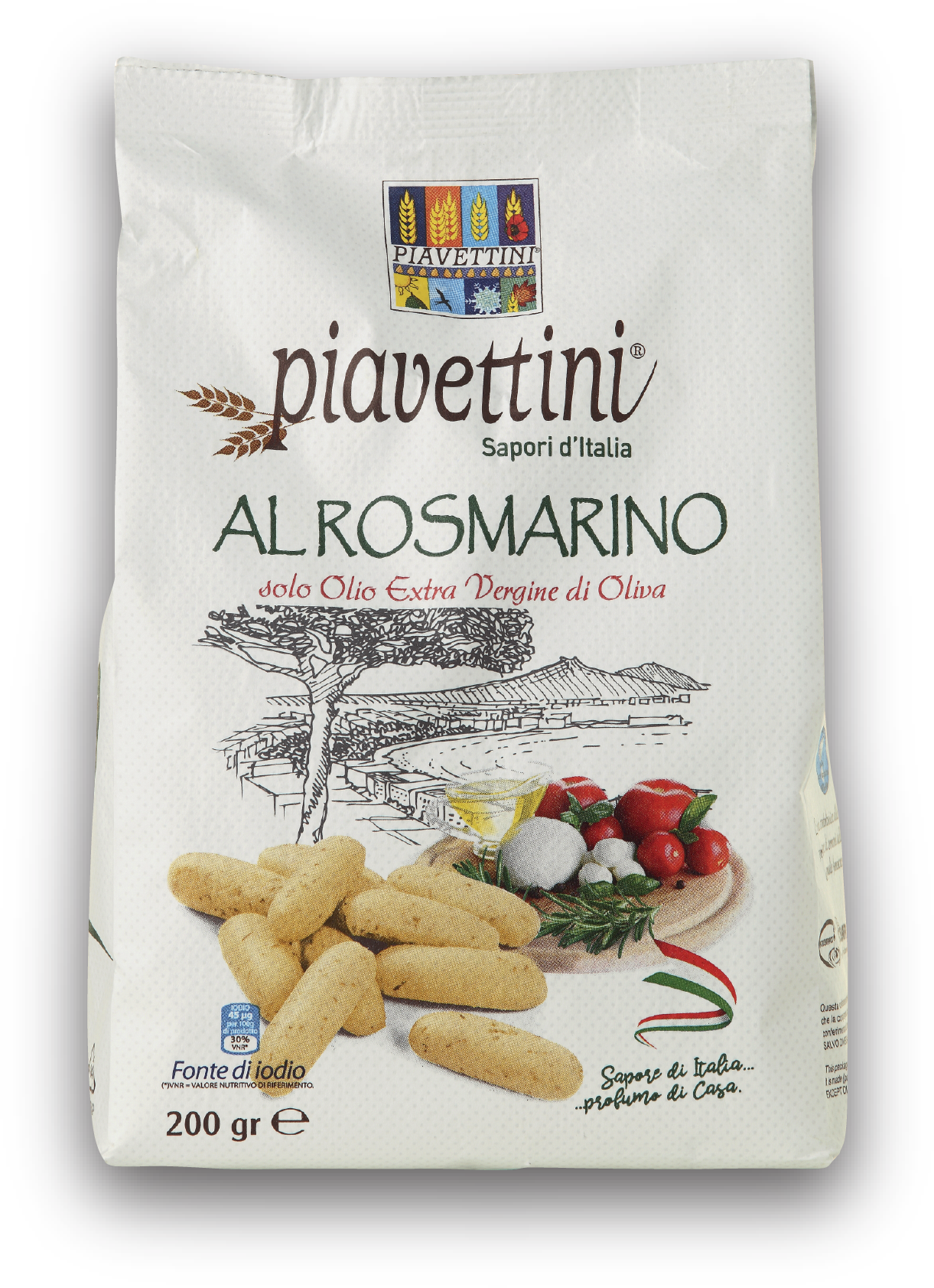 Farina di grano tenero tipo”O”, olio extra vergine d’oliva (7%), olio di semi di girasole alto oleico, sale iodato (sale iodato di potassio 0,007%), lievito (lievito saccharomyces cerevisiae), estratto di malto d’orzo (malto di orzo, farina di grano), rosmarino disidratato (0.6%), aromi naturali. Contiene grano, orzo, e tracce di soia, latte, sesamo, senape, lupini.